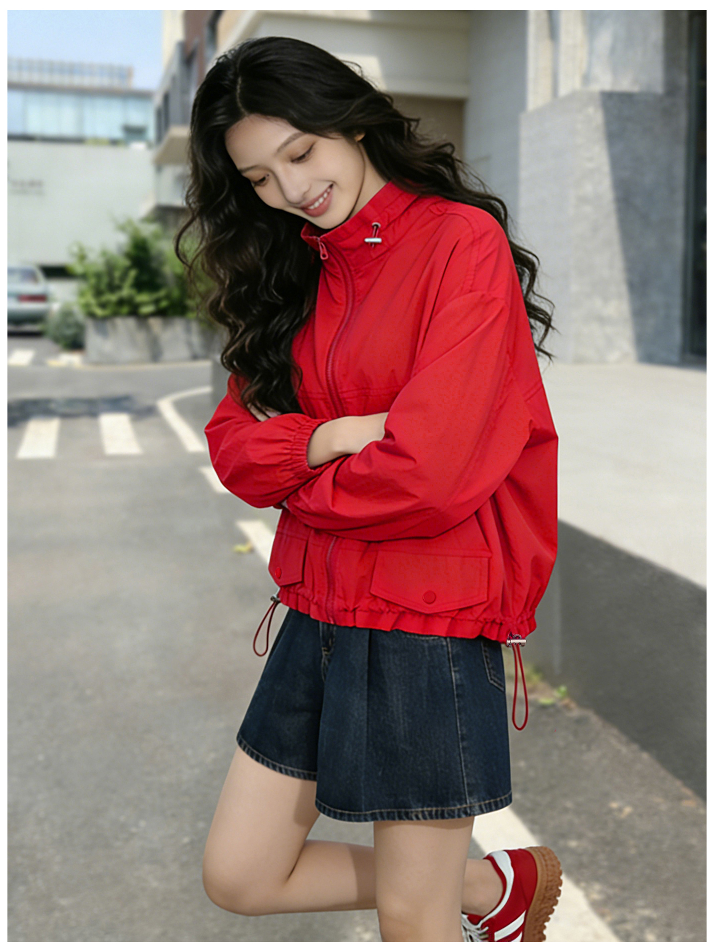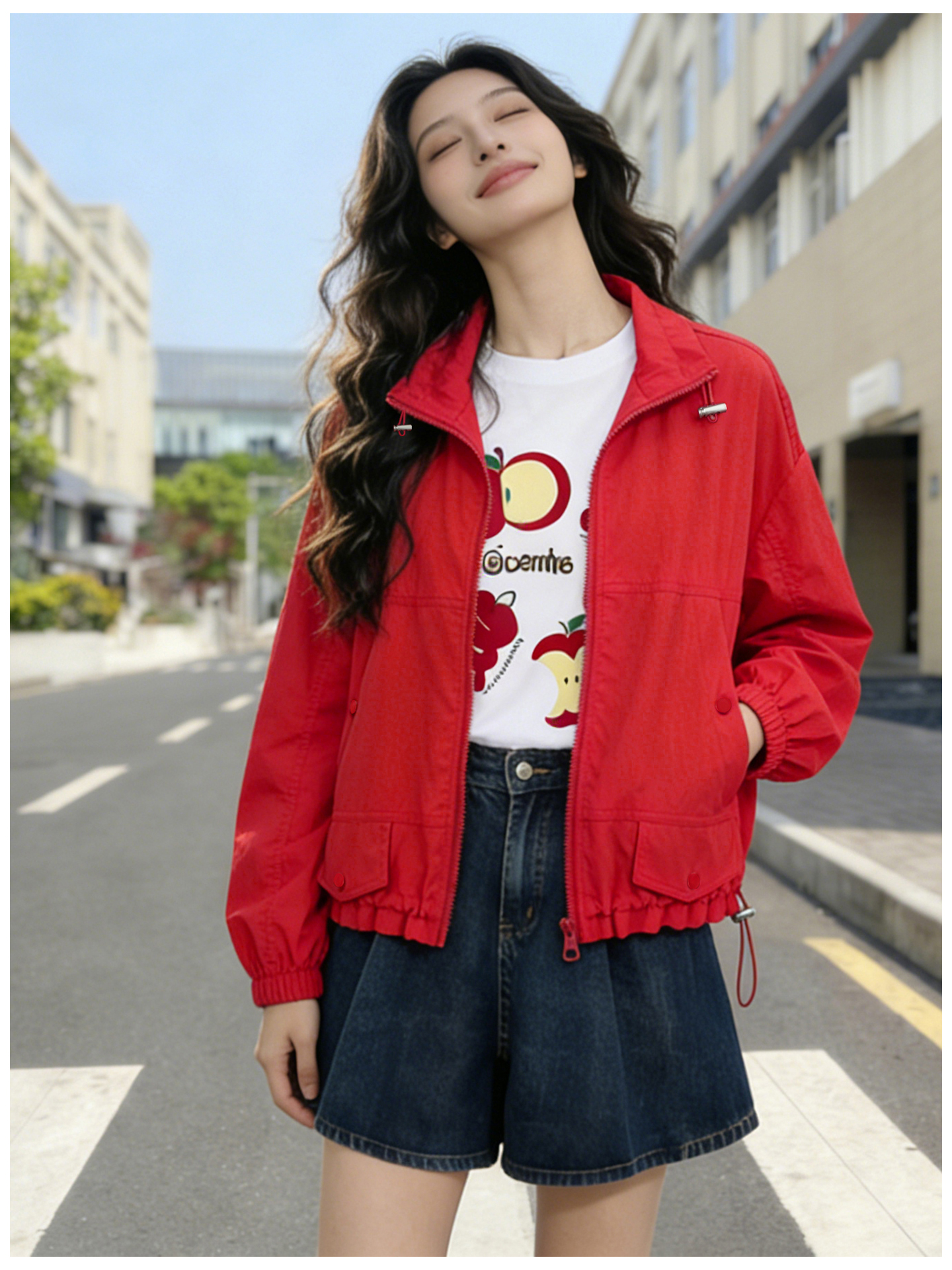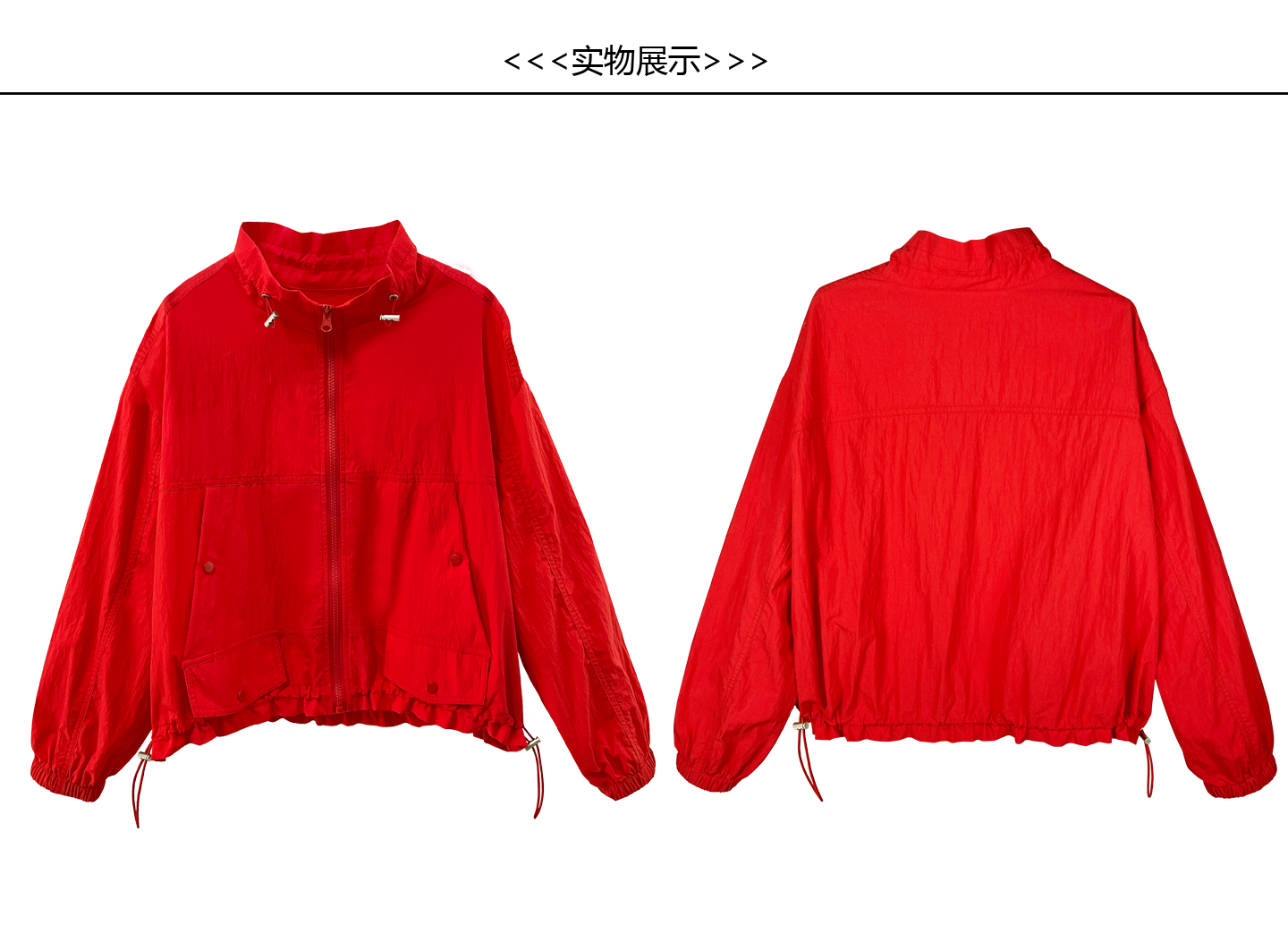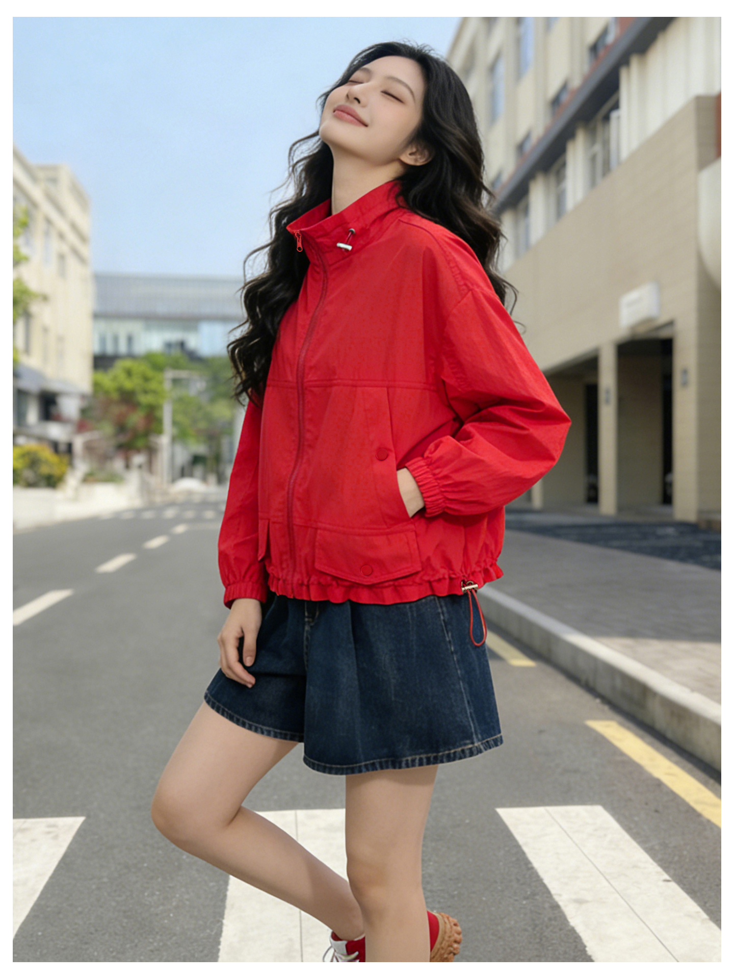 SG1213款2026初夏新款单层短款透气薄外套女小个子立领宽松时尚红色防晒衣(锦棉柔软薄面料)