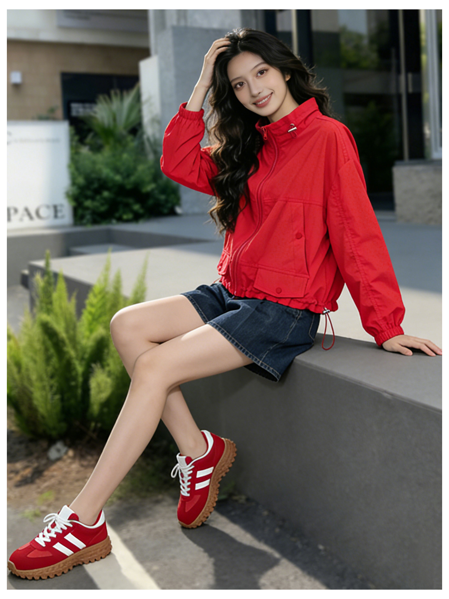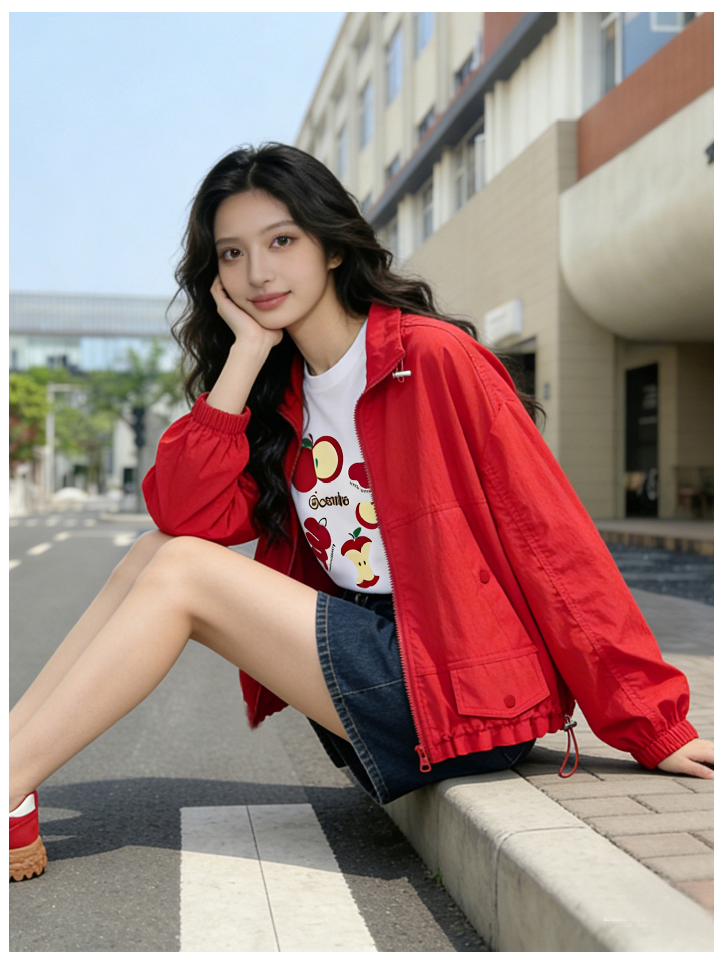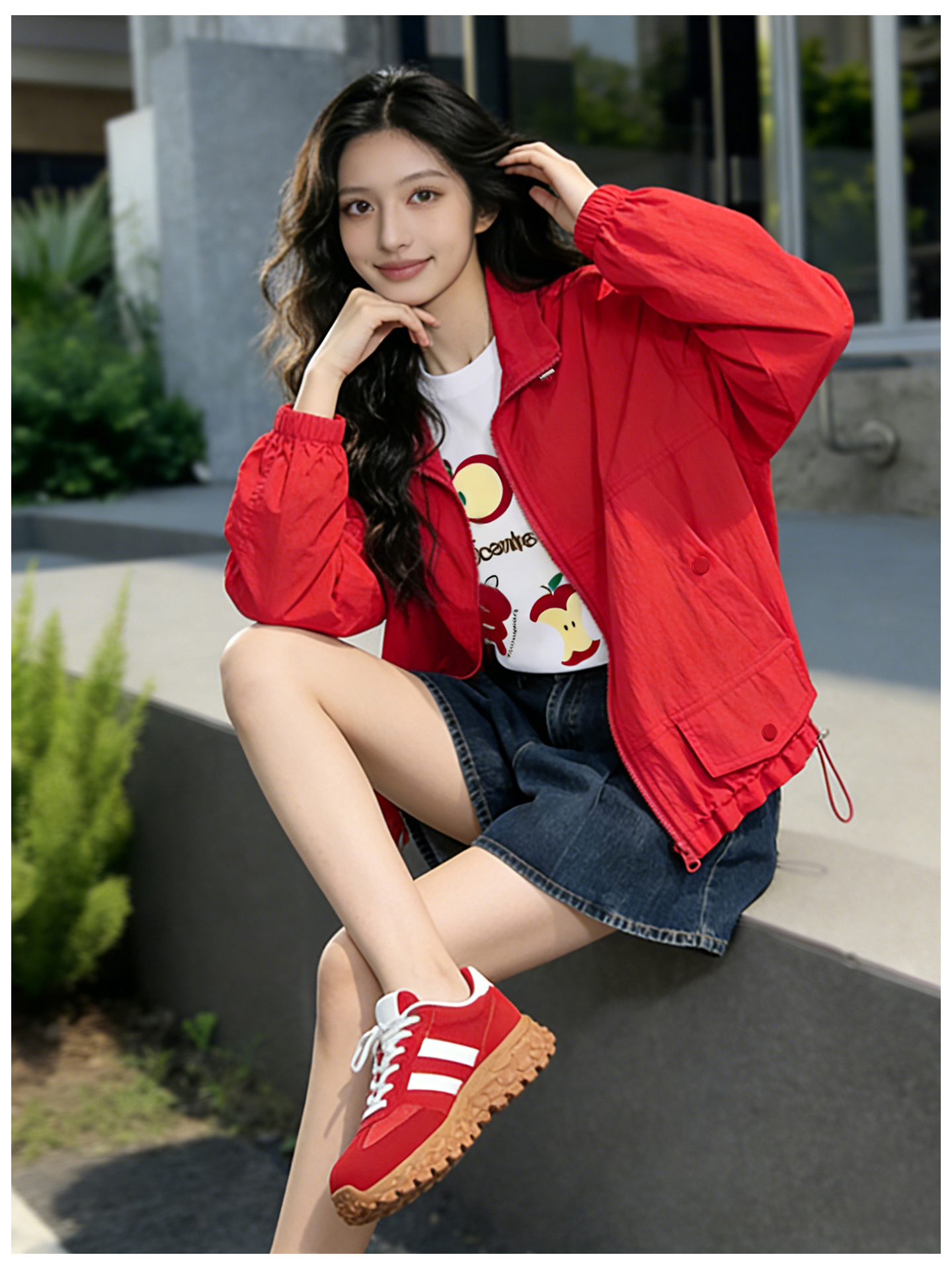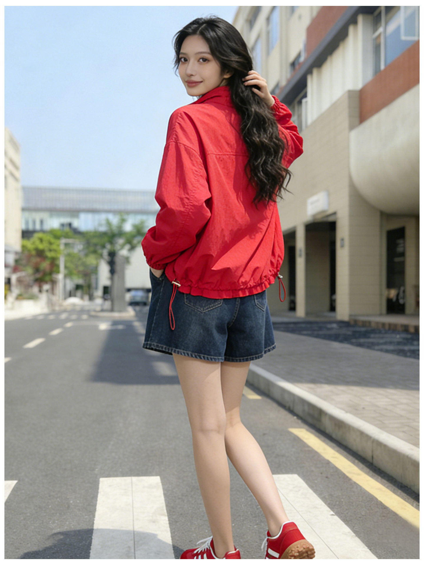SG1213款2026初夏新款单层短款透气薄外套女小个子立领宽松时尚红色防晒衣(锦棉柔软薄面料)